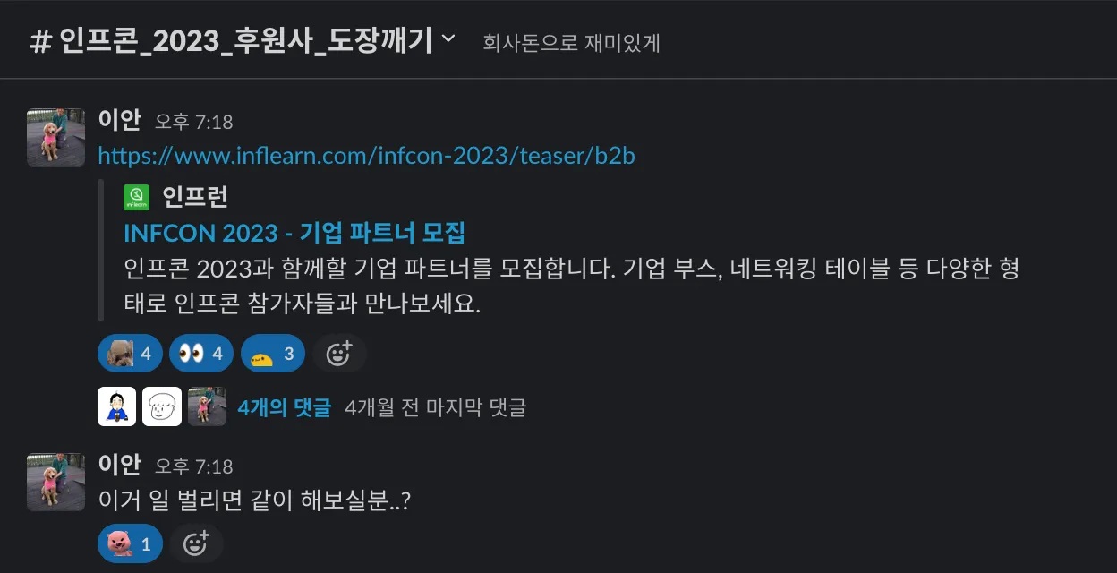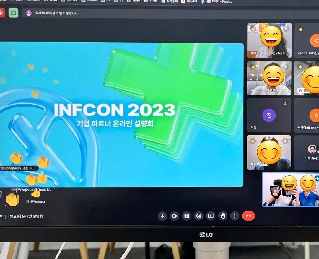 인프콘 2023이 열리는 8월 15일까지 1달쯤 남았을 때인 7월 초, 인프콘 2023 기업 파트너 온라인 설명회가 열립니다. 저는 인프콘 헤렌 담당자 중 한 명으로서 설명회에 참석했어요. 링크드인과 DevRel 커뮤니티에서 자주 뵈었던, 보면서 정말 많이 배웠던 셀럽(?) 분들과 함께한다는 사실에 내적 신남을 숨길 수 없었습니다