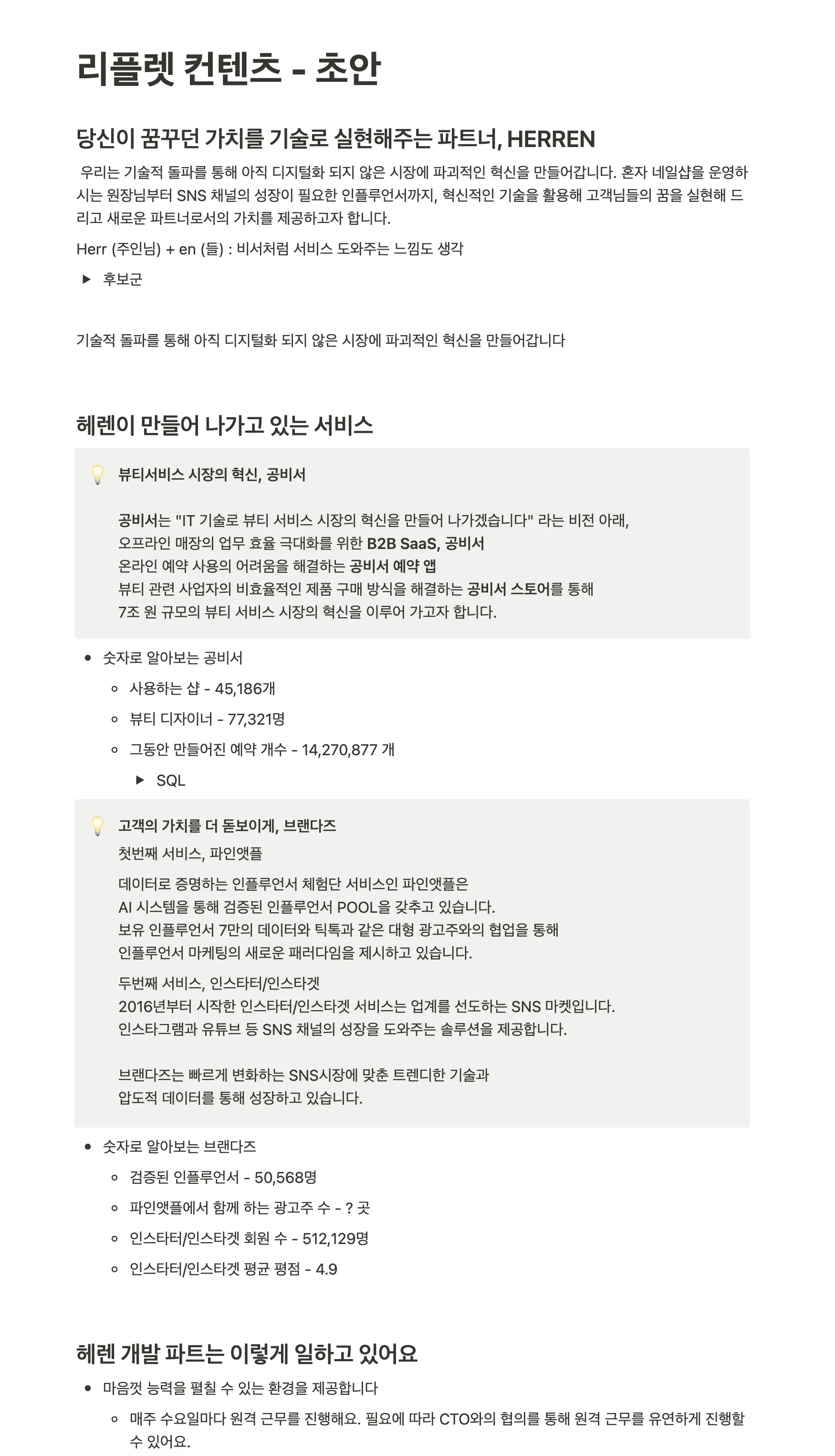 마지막으로 지난 4개월을 돌이켜보면, 제 메인 업무인 Front-end 개발을 문제없이 진행하면서 동시에 인프콘 준비를 병행하다 보니 정말 힘들고 피곤할 때도 잦았다고 느낍니다. 하지만 인프콘이 다가오면서 우리가 온 힘을 다해 준비했기 때문에 자신 있게 우리가 준비한 것들에 관해 이야기하고 홍보할 수 있었고, 인프콘 당일에도 정말 많은 분께 우리가 만들어 낸 결과물을 토대로 자신 있게 헤렌의 모든 것에 대해 어필할 수 있었다고 생각합니다. 현장에서 직접 듣고 마주한 참가자분들, 다른 기업 파트너분들의 긍정적인 반응들과 인프콘이 끝난 후에 링크드인을 통해서 오는 긍정적인 피드백들을 보고 있으면 정말 값지고 뿌듯한 경험으로 기억에 남을 것 같아요:D