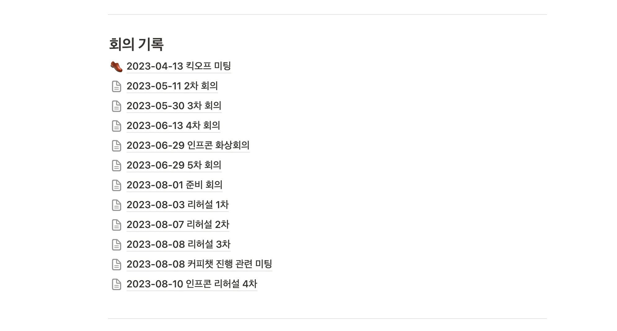 인프콘 2023에 참가가 확정된 후 축제 분위기에 빠져 있던 운영팀은 곧 현실을 마주하게 됩니다. 4개월 안에 인프콘에서 우리가 보여 줄 모든 것들을 기획하고 만들어서 현실에 나오게 해야 했기 때문이죠. 부랴부랴 전체 회의와 세부 조직 별 미팅이 잡힙니다.
