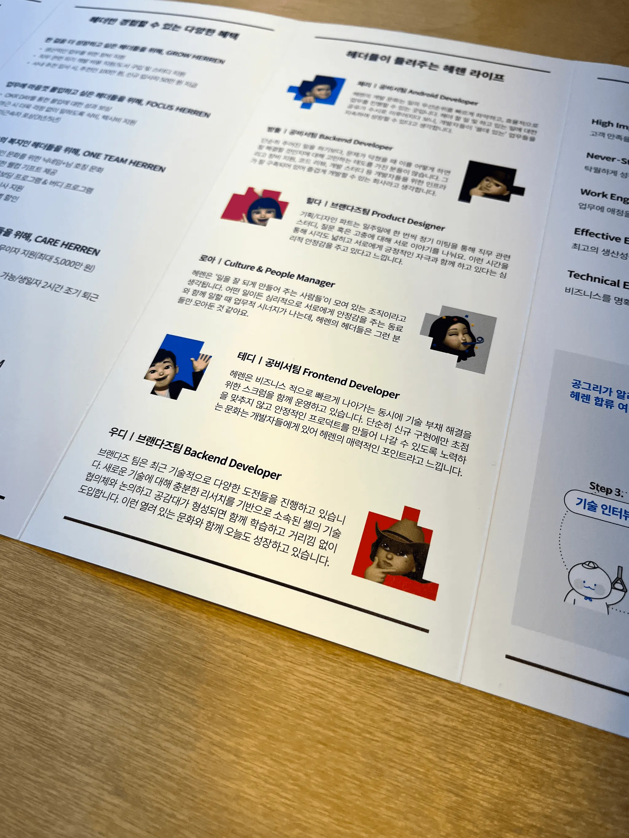 리플렛 초안을 작성하면서 다른 파트와 끊임없는 소통은 필수였어요. 헤렌 부스에 방문하는 참가자분들은 리플렛을 하나씩 받으실 텐데, 리플렛 안에 부스에서 진행하는 프로그램에서 활용할 수 있는 정보를 넣을지, 부스 디자인에 들어갈 내용과 리플렛의 컨텐츠, 그리고 우리가 가져갈 컨셉과 톤앤매너가 전체적으로 통일된 느낌을 주는지도 정말 많은 고민이 필요했기 때문이에요. 그래서 인프콘 운영팀 내부 미팅 뿐만 아니라 CP(Culture & People) 팀, 그리고 헤렌의 대장님이신 파이 님과도 수시로 의견을 교환하면서 완성도 높은 결과물들이 만들어졌습니다