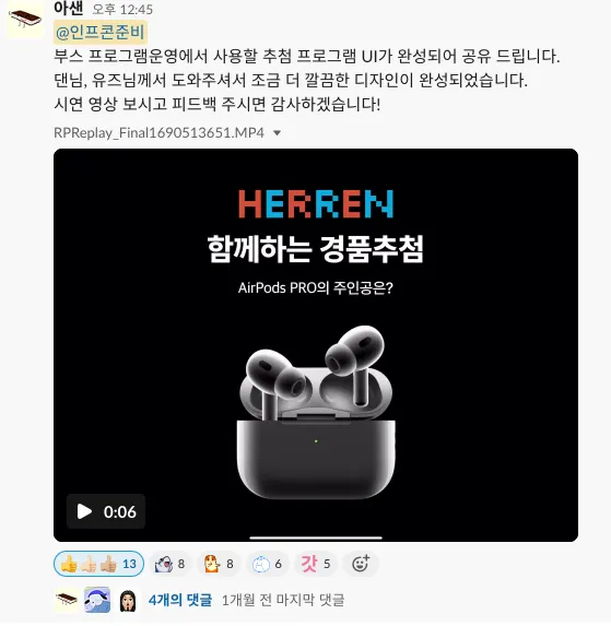 추첨 프로그램을 직접 만든 파트너사는 우리가 유일했다. 재능 기부한 아샌, 혀니님에게 박수를