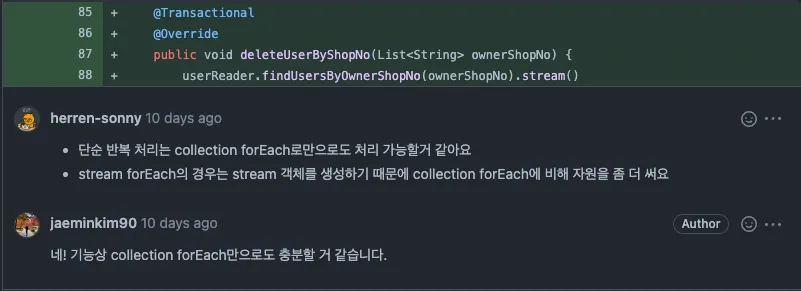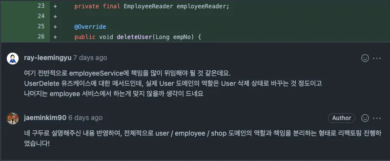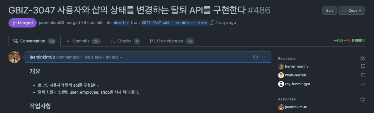맡게 된 기능은 새로운 회원 탈퇴 API 개발과 기존 탈퇴 로직의 개선 작업이었습니다. 비교적 간단한 작업이었지만, PR 후 Merge에 이르는 과정은 꽤나(?) 험난했습니다. 코드양이 그리 많지도 않았고, 요구사항도 간단한 편이었지만 무려 72개의 코멘트를 주고받은 후에야 운영 서버에 배포할 수 있었습니다.