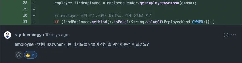 위 콘멘트는 “책임을 위임하면 좋겠다”는 단순한 피드백처럼 보일 수 있지만, 그 안에는 객체를 자율적인 존재로 생각해야 한다는 중요한 개념이 포함되어 있습니다.