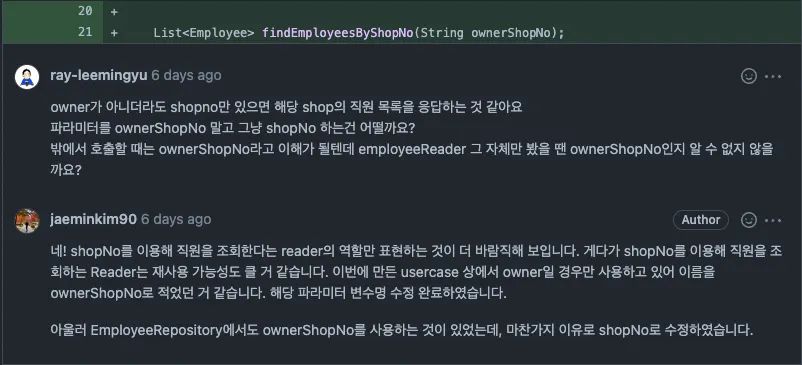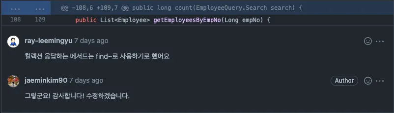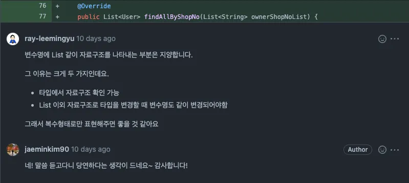 꼭 컨벤션이 아니더라도, 메서드의 명확한 표현을 위해 어떠한 표현 방식이 더 적합한지 피드백을 받을 수 있었습니다. 쉽고 명확한 코드 가독성을 위해 꼼꼼한 리뷰를 남겨주시는 게 느껴져 감사했습니다.