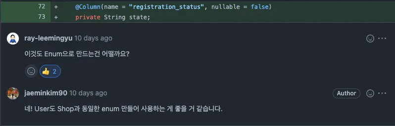 결론부터 말씀드리면, 왜 많은 분이 코드 리뷰를 강조했는지 확실하게 느껴볼 수 있었습니다. 동료 개발자분들이 남겨주신 코멘트 하나하나를 읽어 보면서 "아하!" 의 순간도 있었고, "왜 이런 것도 생각하지 못했을까" 싶을 때도 있었습니다.