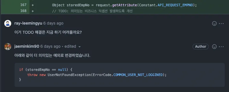 예외 처리가 필요하다는 코멘트에 이어, 적합한 에러 메시지 사용에 대한 피드백도 받을 수 있었습니다.