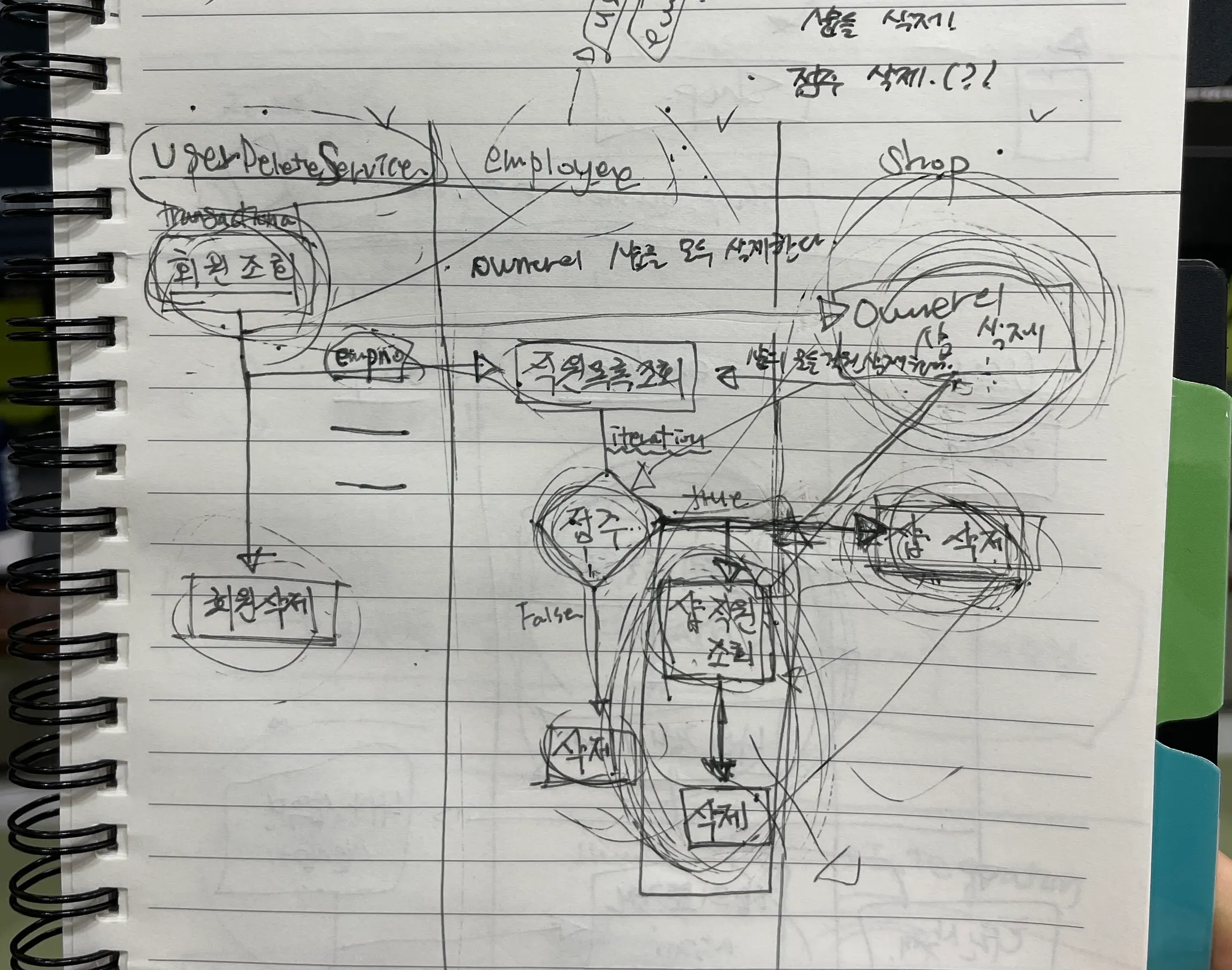 최초의 구조는 하나의 도메인 객체가 너무 많은 역할과 책임을 수행하는 문제가 있었습니다. 리뷰를 도와주신 레이님이 각 도메인 서비스의 역할과 비즈니스 시퀀스를 직접 설명해 주었습니다. 노트에 그림을 그려주며 자세하게 설명해주신 덕분에 어떤 방향으로 설계해야 하는지 이해할 수 있었습니다. 설계에 대한 설명 전반에는 객체지향적 사고를 돕는 가이드가 포함되어 있었습니다. 예전에 조영호 님의 <객체지향의 사실과 오해>라는 책에서 읽었던 내용이 갑자기(?) 와닿는 신기한 경험을 할 수 있었습니다.