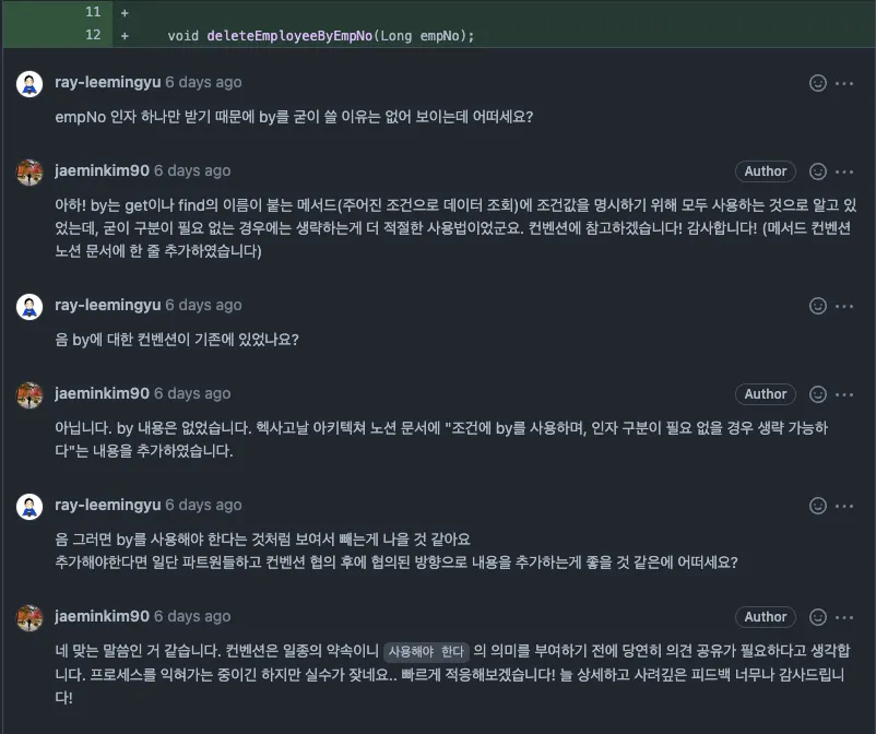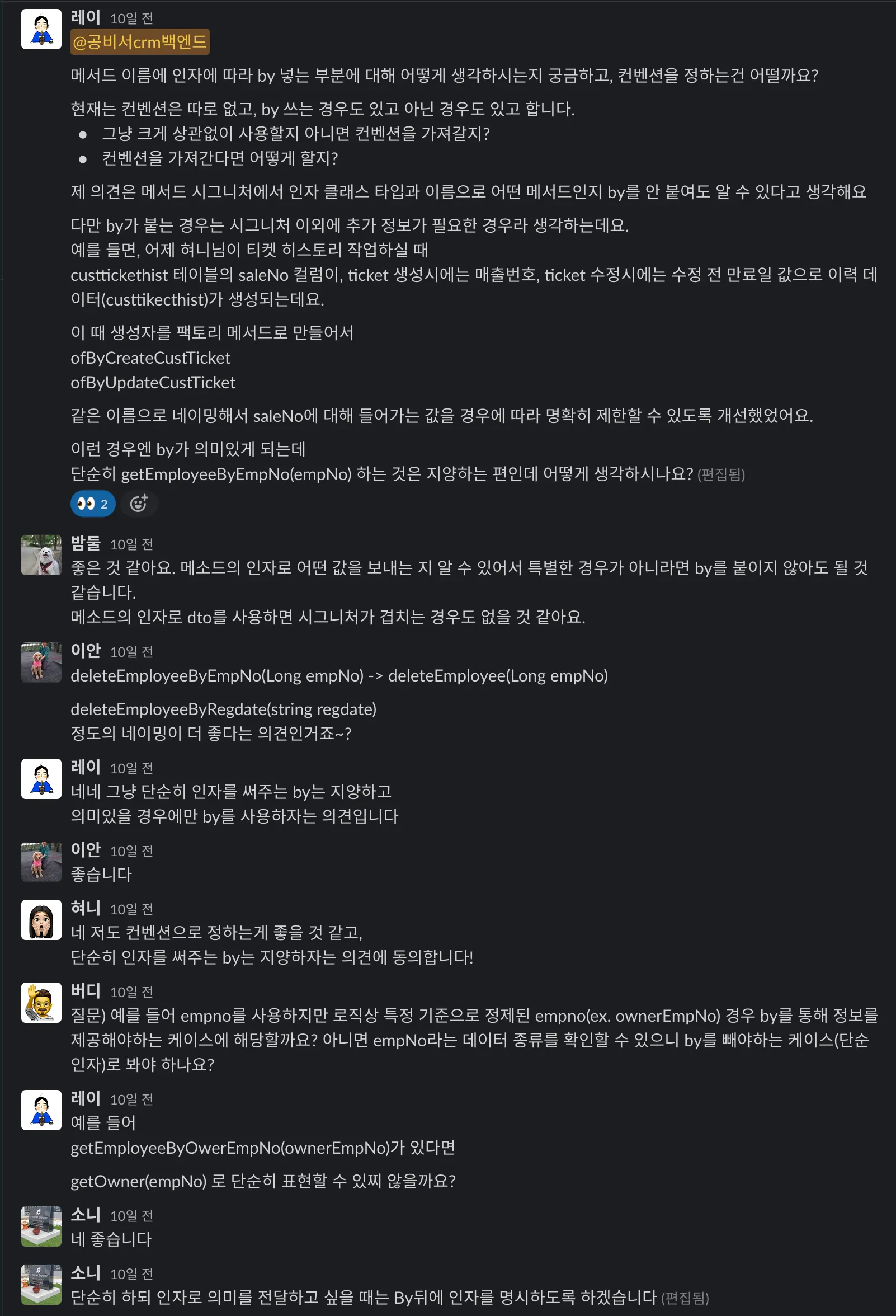 피드백 내용을 기반으로 슬렉에서 빠르게 논의가 진행되었습니다. by 사용에 대한 새로운 컨벤션이 탄생하는 순간이었습니다.