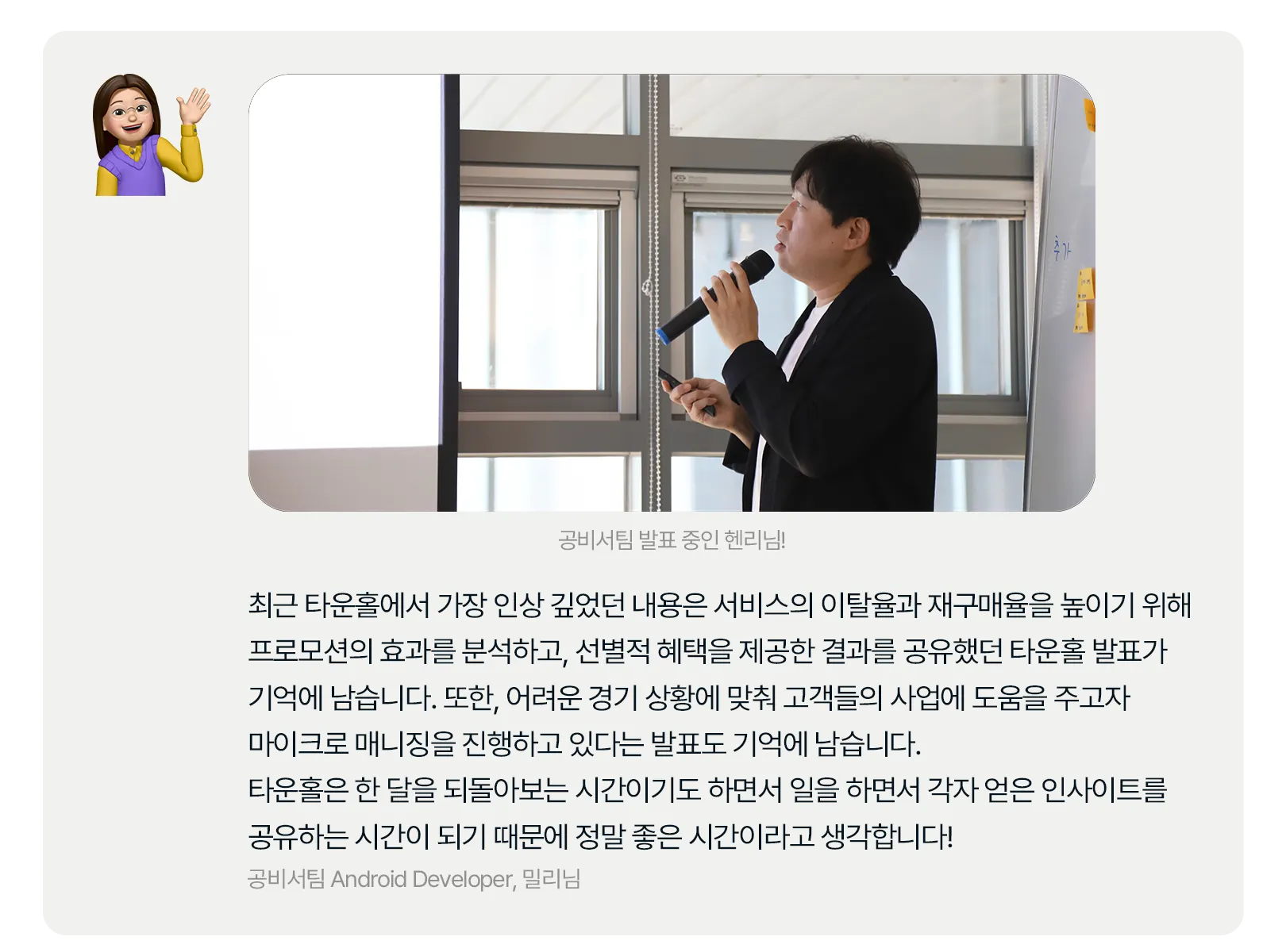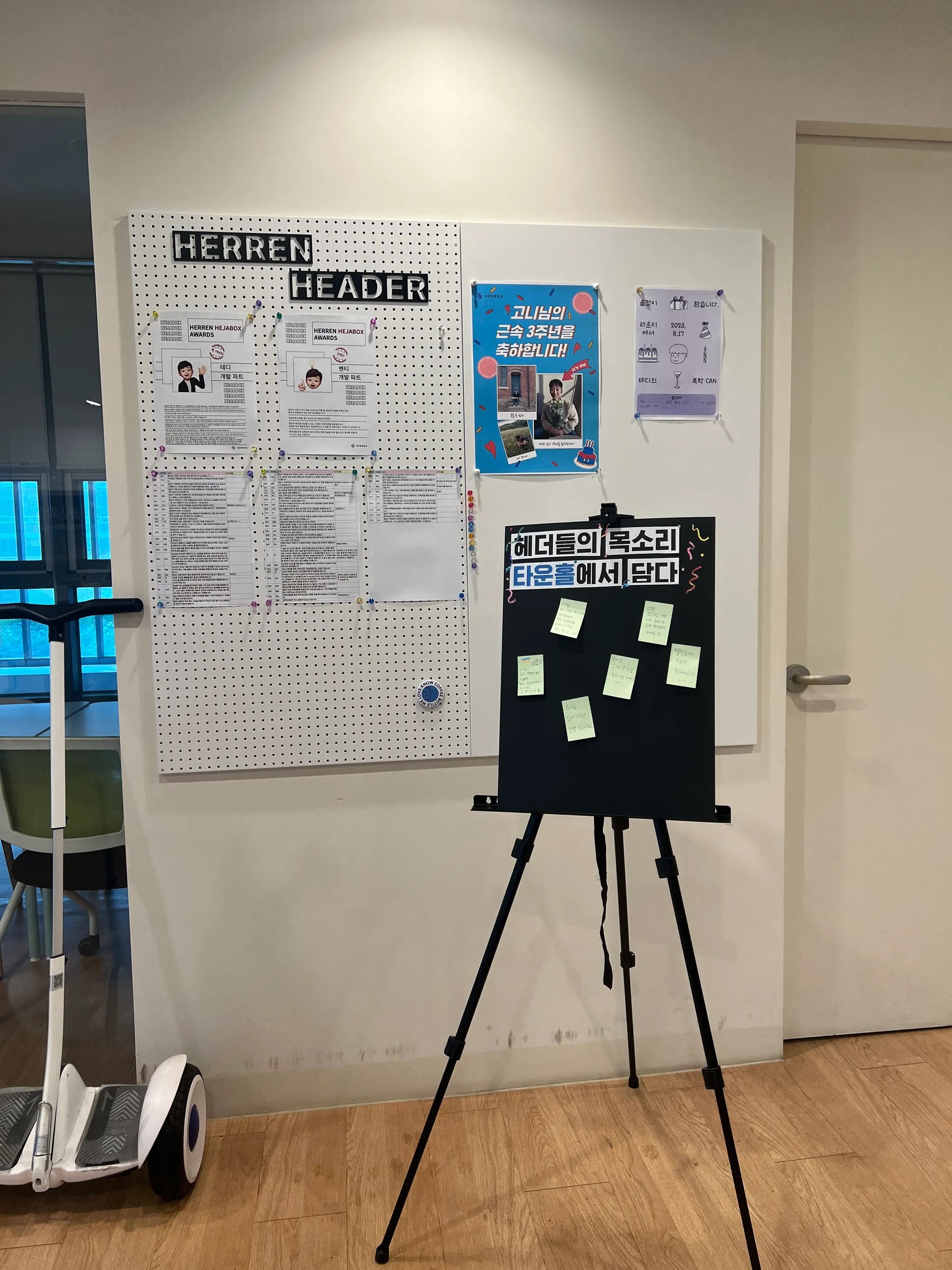 헤렌은 건강한 피드백 문화를 굉장히 중요시 여기고 있다고 말씀드렸었는데요. 타운홀이 끝나면 라운지에 짧은 코멘트를 남길 수 있는 게시판이 세워지고, 이번 타운홀에서 좋았던 점, 인상 깊었던 발표 내용, 응원하고 싶은 헤더에게 한마디 등을 남길 수 있습니다!