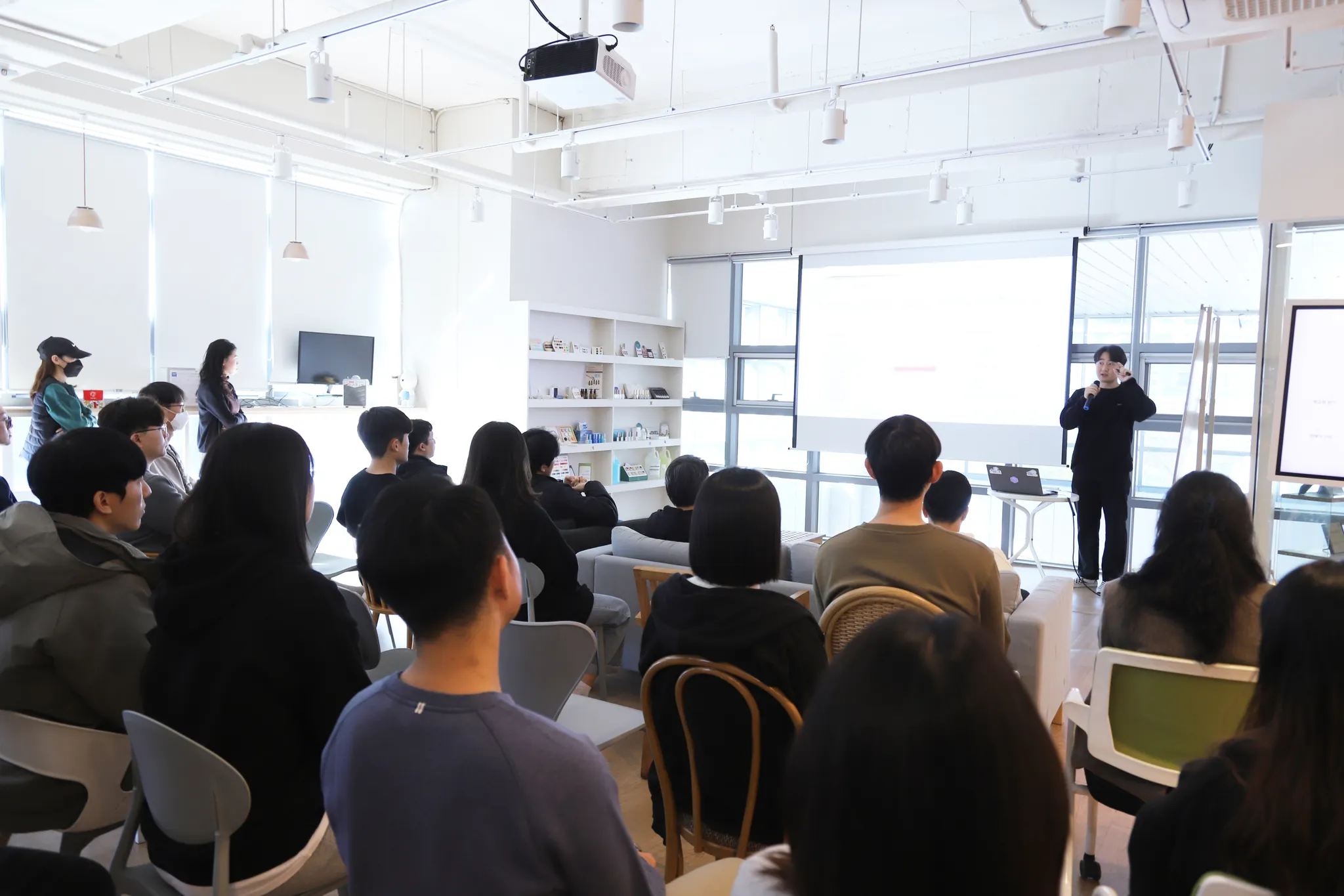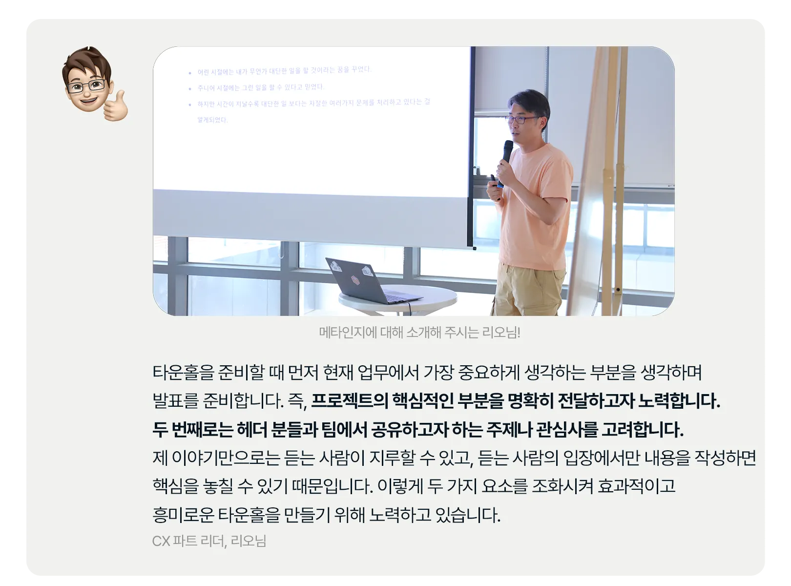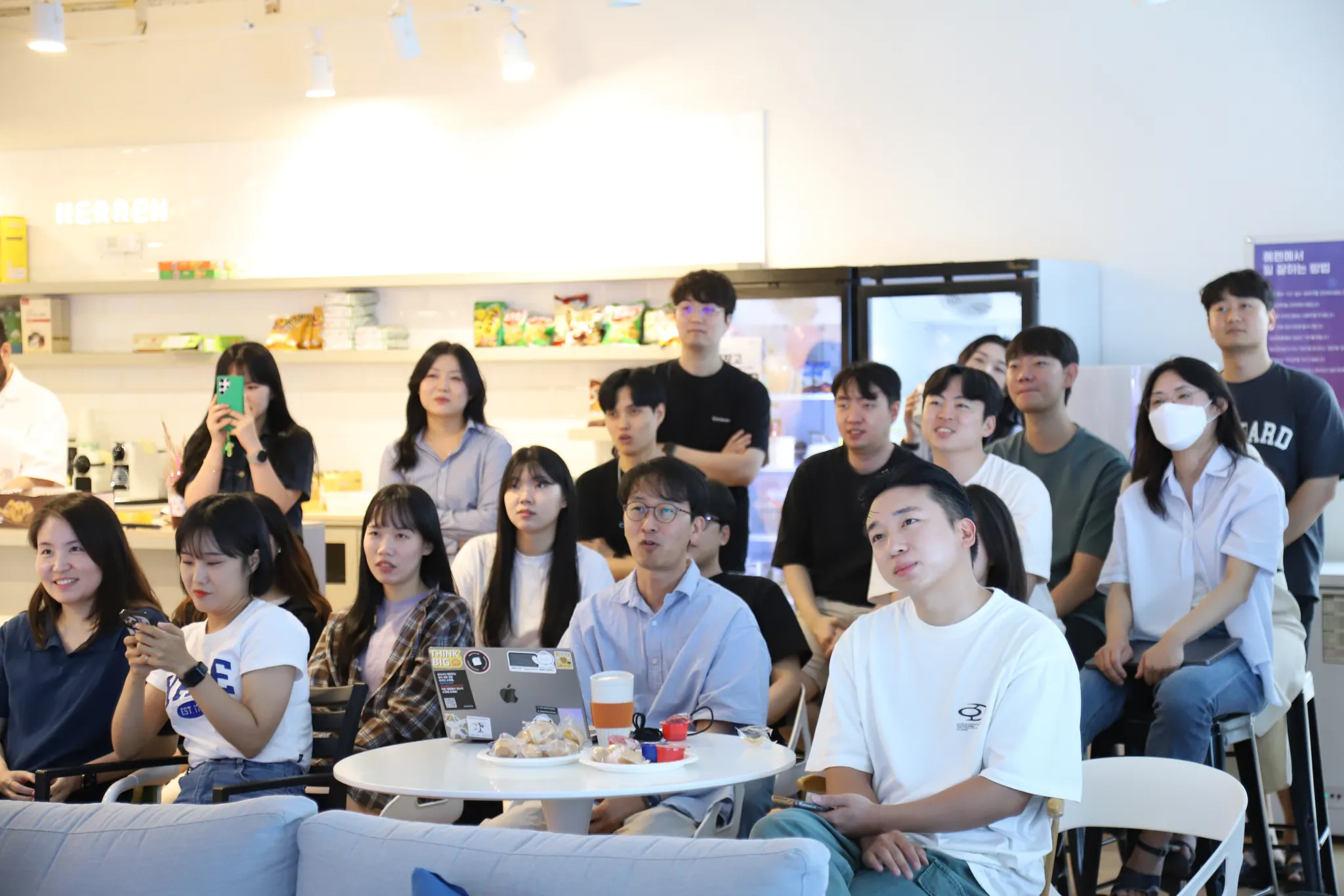 헤더 모두 자율적인 권한을 갖고 주체적으로 일 하기 때문에 누구나 발표에 참여할 수 있어요. 어떤 달에는 개발자가 발표를 하기도 하고, 어떤 달에는 마케터, 그리고 CX 담당자가 발표를 하기도 합니다.
