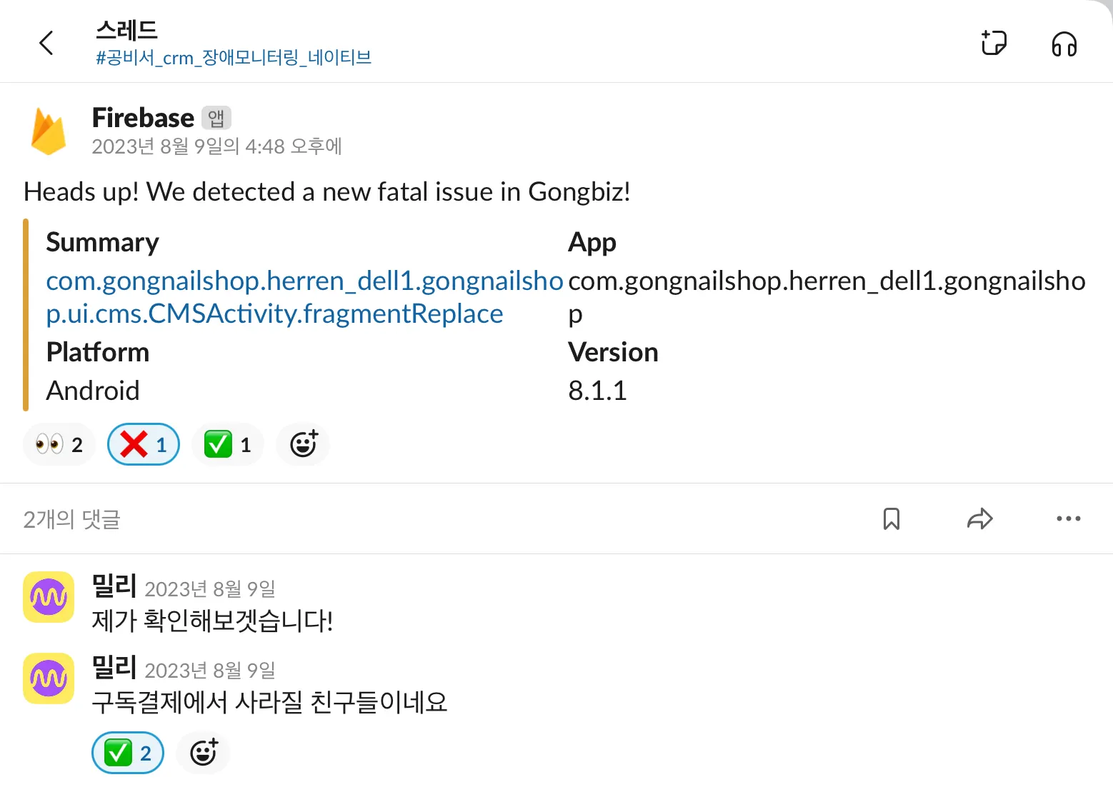 앱에서 비정상 종료나 충돌이 감지되면 실시간으로 Slack으로 알림이 전송되도록 설정했습니다.