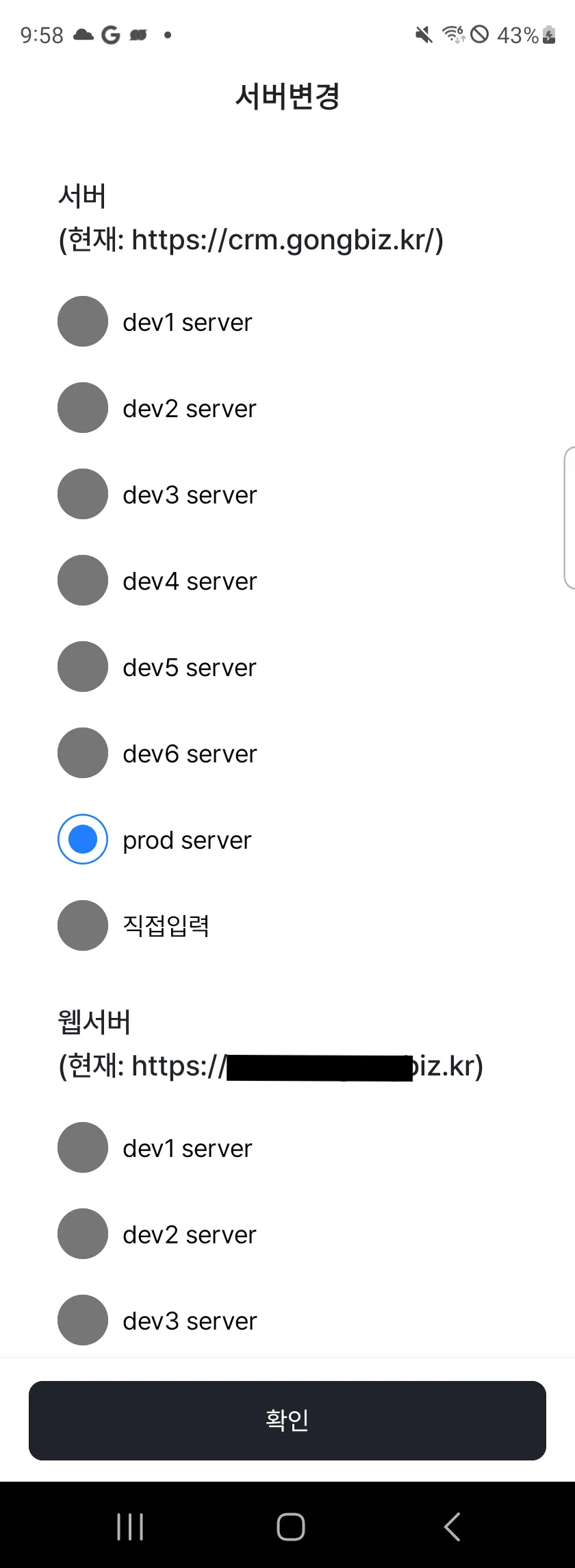 서버/웹 서버를 변경할 수 있는 화면을 구현했습니다.