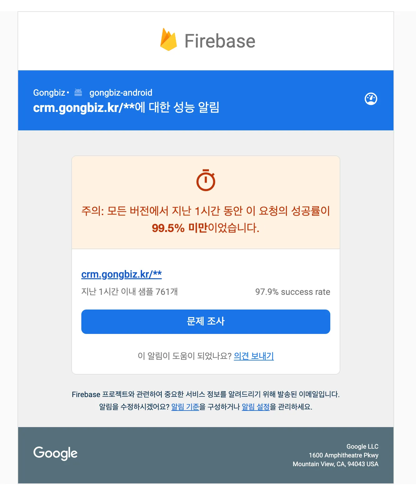 앱 성능에 관련되어 중요한 부분에 맞춤 설정하여 메일로 즉각 받아볼 수 있도록 알림을 설정했습니다.