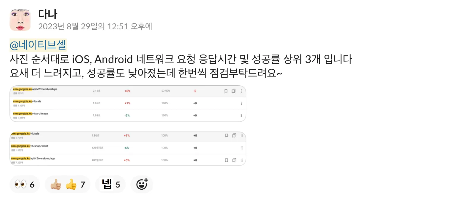 해당 이슈가 사용자에게 큰 영향을 주기 전에 성능 이슈를 발견하여 대응할 수 있었습니다.