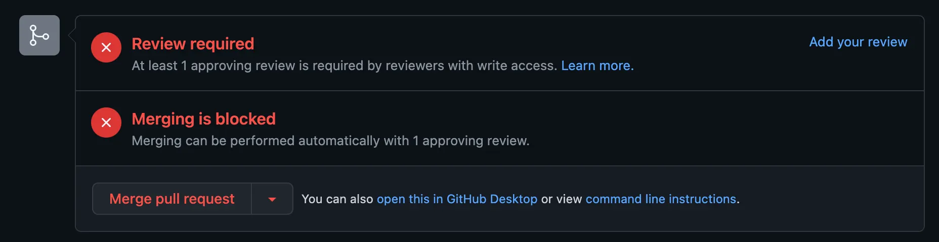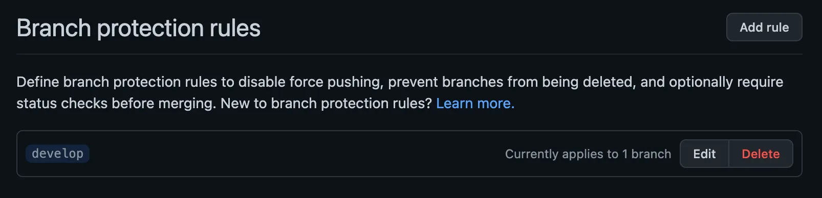 PR은 개발 브랜치 대상으로 작성하고 리뷰어가 승인을 해야 병합할 수 있도록 Branch protection rules을 적용하였습니다.