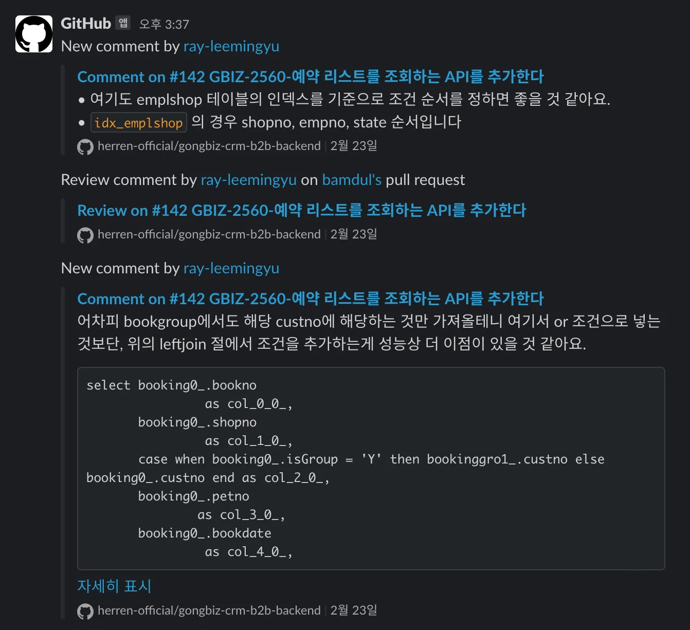 현재도 저희 백엔드 파트에서는 활발하게 리뷰가 이뤄지고 있고 실제로 서비스 개발과 개인 역량 강화에도 많은 도움이 되고 있습니다. 앞으로 저도 더 발전된 리뷰로 기여할 수 있기를 바라며 이만 줄이겠습니다. :-)