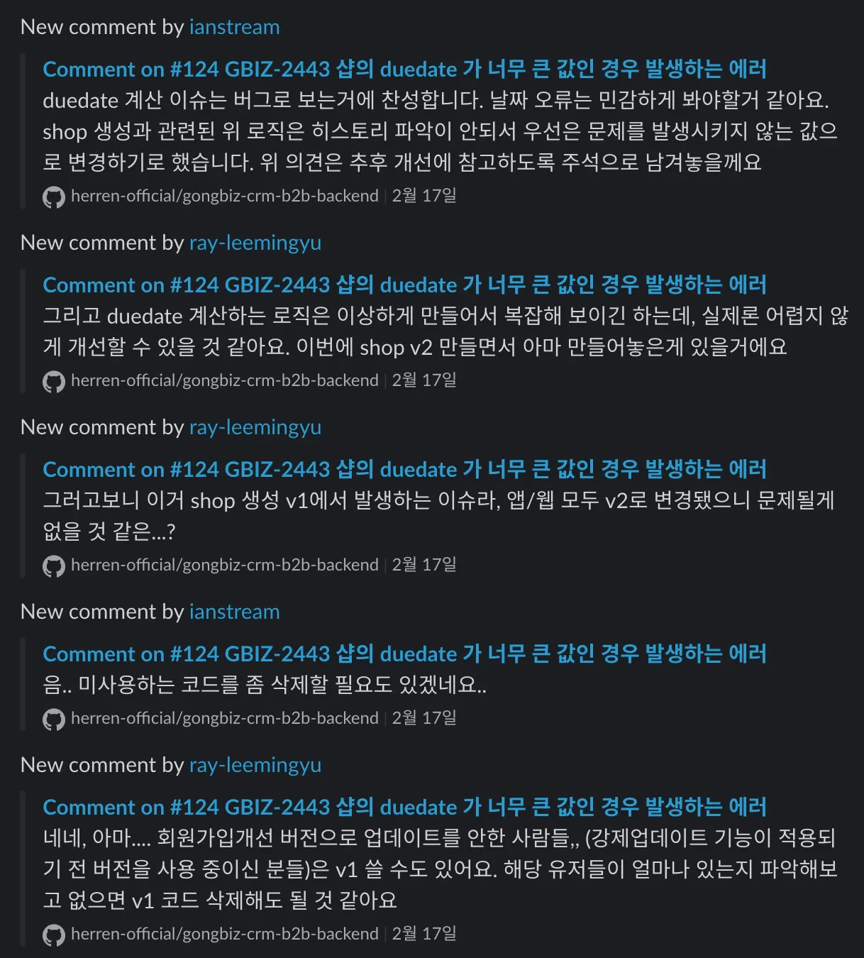 실제 리뷰를 받다 보면 버그가 예상되는 부분이나 개선이 필요해 보이는 부분들이 많았습니다. 다른 분의 객관적인 시각이 필요하기 때문에 피드백 받고 수정하는 과정을 거치고 있습니다. 개인 업무 시간을 할애해서 리뷰해주시면서도 꼼꼼히 봐주셔서 감사하게도 운영으로 가기 전에 리스크를 줄일 수 있었고 이런 장치들이 있어서 자연스럽게 코드 리뷰의 장점과 중요성을 체감할 수 있었습니다. 더 나은, 개선된 개발을 위해 아이디어를 나누기도 하지만 서비스의 완성도, 안정성을 위해서 코드 리뷰는 꼭 필요하다는 생각이 들었습니다.